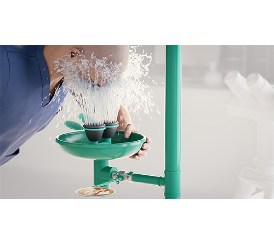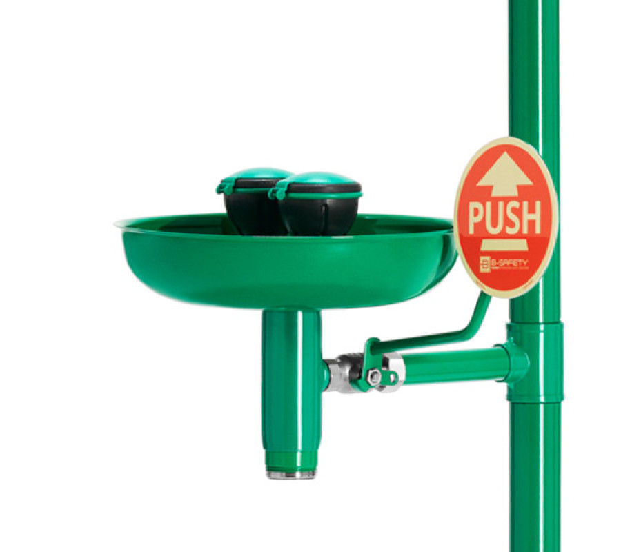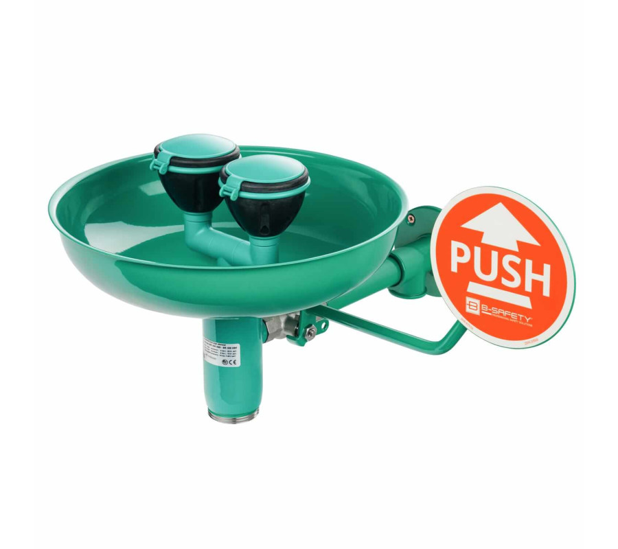 Stacjonarna oczomyjka z miską (myjka do oczu) do montażu na ścianie. Miska wychwytuje i odprowadza zużytą wodę, a zintegrowany regulator utrzymuje stały przepływ 14 l/min, zapewniając normatywny, delikatny strumień. Duża dźwignia PUSH jest fotoluminescencyjna, dzięki czemu stanowisko łatwo zlokalizować.