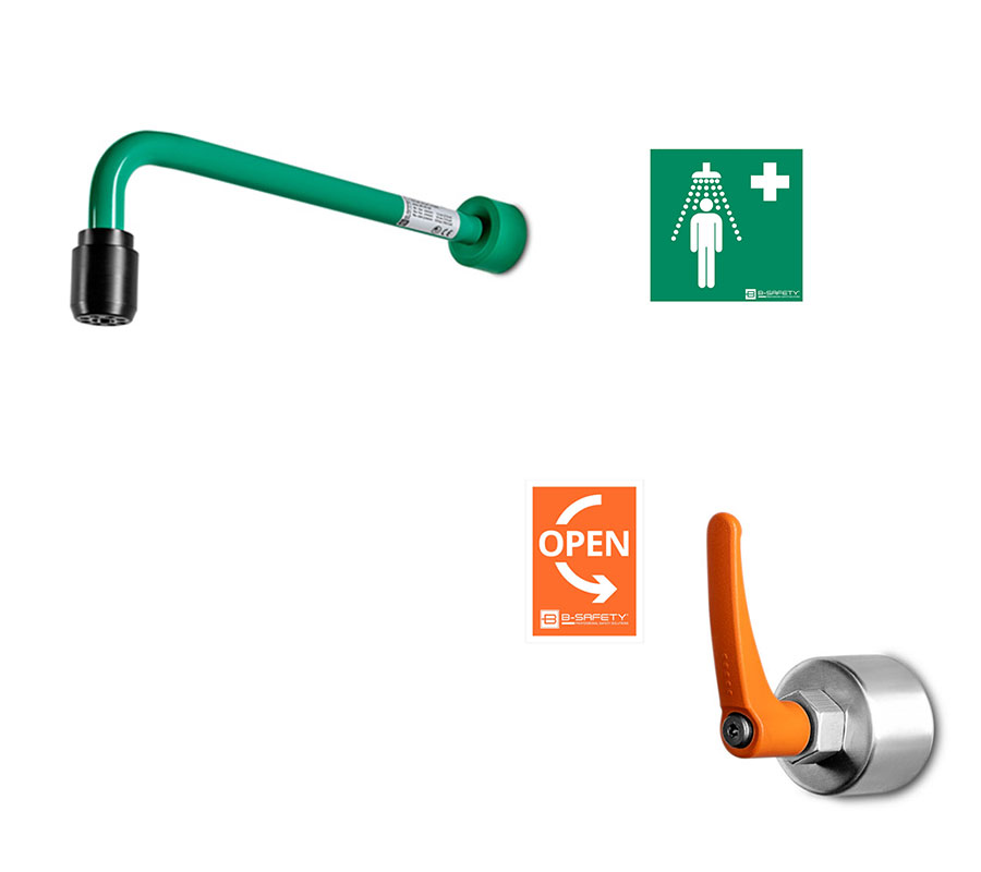 Prysznic bezpieczeństwa do szybkiego spłukiwania skóry po ekspozycji. Głowica B-SAFETY jest samoodwa..