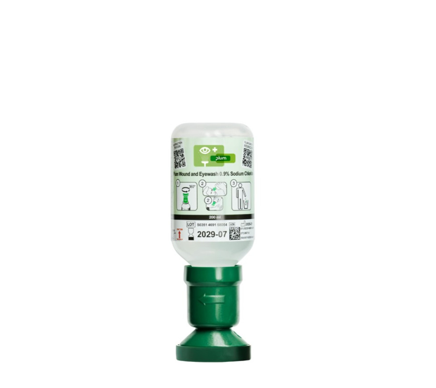 Płuczka do oczu i ran Plum 200 ml z końcówką eyecup — sterylny roztwór 0,9% NaCl przeznaczony do płukania oczu oraz przemywania ran w sytuacjach pierwszej pomocy.