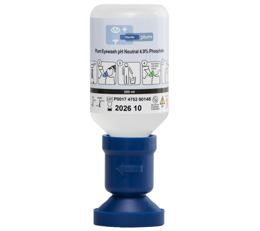 Płuczka do kwasów i zasad – Plum pH Neutral 200 ml (bufor fosforanowy 4,9%) z końcówką eyecup; po neutralizacji kontynuuj płukanie 0,9% NaCl.