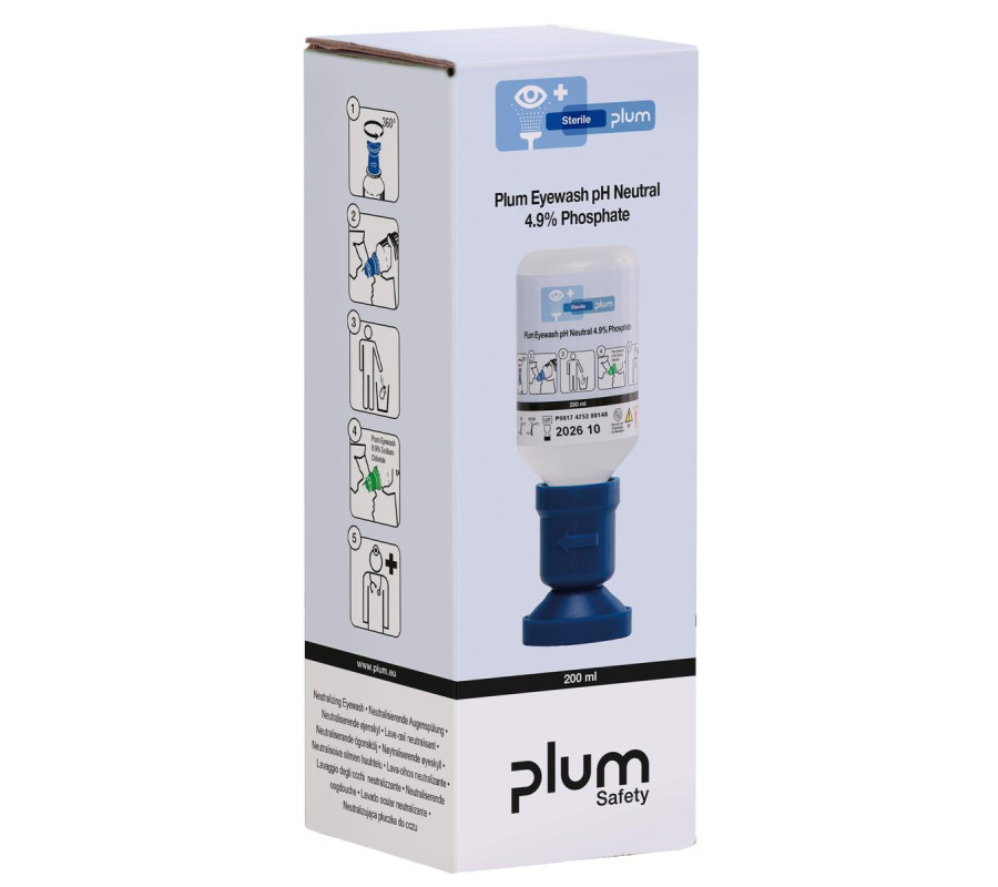 Płuczka do kwasów i zasad – Plum pH Neutral 200 ml (bufor fosforanowy 4,9%) w pudełku (one-bottle box) z końcówką eyecup; po neutralizacji kontynuuj płukanie 0,9% NaCl.