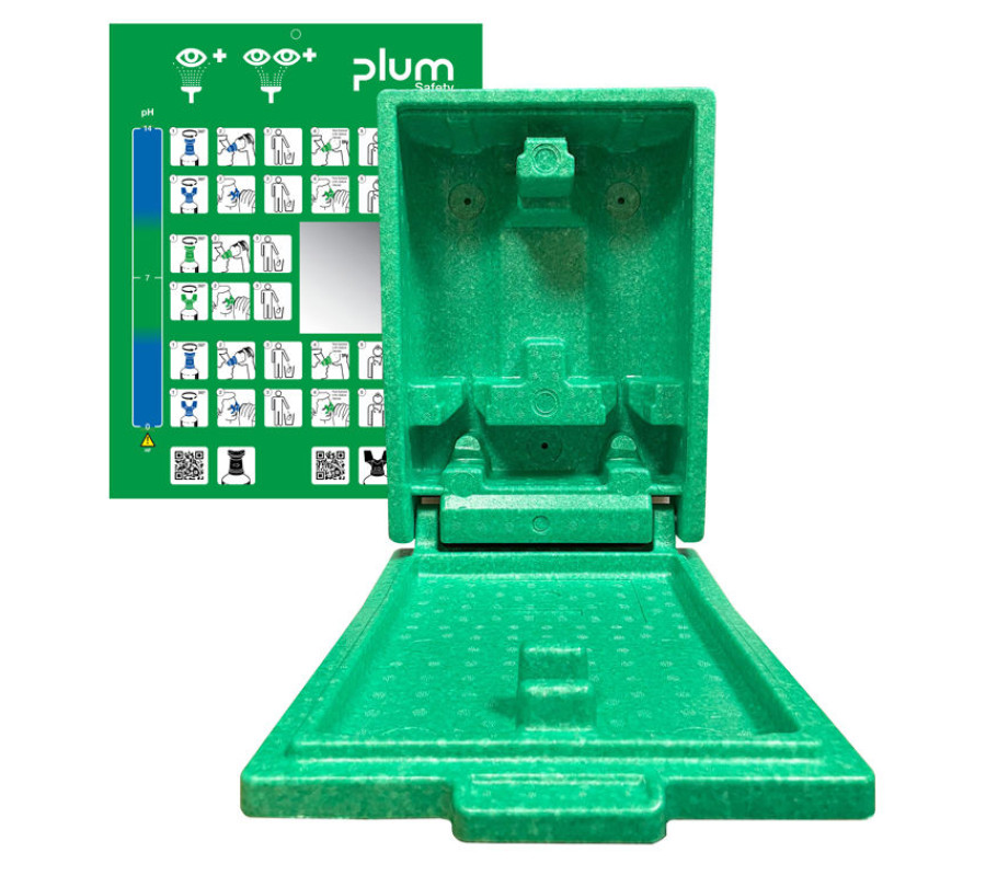 Plum Eyewash Box to pusta stacja ścienna do montażu butelek Eyecup i DUO w miejscach, gdzie istnieje ryzyko skażenia oczu pyłem, opiłkami metalu lub substancjami chemicznymi. Umożliwia utworzenie wyraźnie oznaczonego punktu pierwszej pomocy z zawsze dostępnym płynem do płukania oczu, nawet w bardzo brudnym lub zapylonym otoczeniu.
