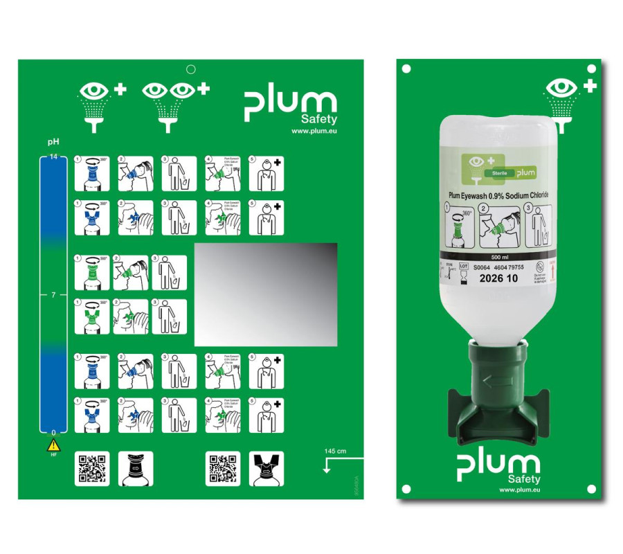 • Zestaw do płukania oka Plum 0,9% NaCl — 500 ml otwarta stacja naścienna